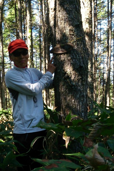 朝、車は道の駅に置いて奈良井駅のそばから林道を上がって行く。大きくカーブを左に曲がった先、右手の山側から開けた沢が入っている。その右岸の踏跡を登ると結界に囲まれた素朴な神社が出て来る。大山神社と標識が付いている。