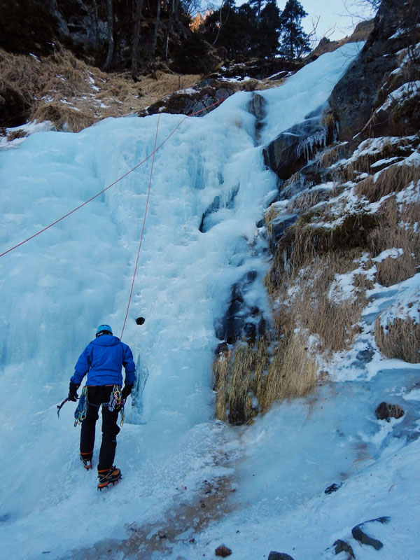 登山道からF1取付きまで、思いのほか歩いた。前回登攀した際は氷が薄く滝の落ち口へ上がる際に苦労したが、今回は十分に結氷している。