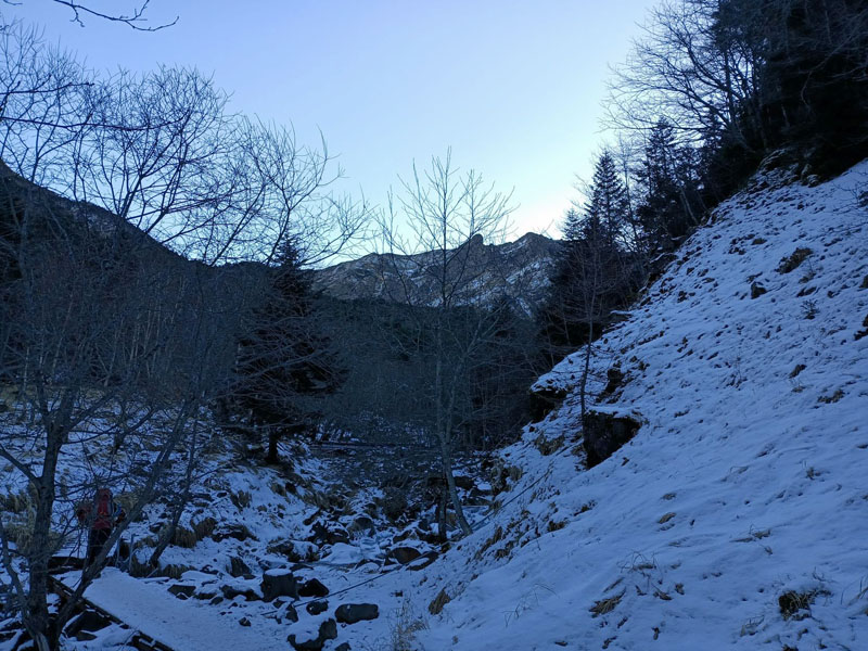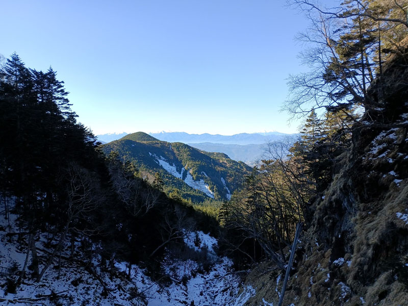 準備を整えて堰堤広場まで歩く。悲しいことに積雪はない。堰堤広場から先は徐々に凍結個所や積雪が出てくる。しばらく歩くと大同心が姿を現す。