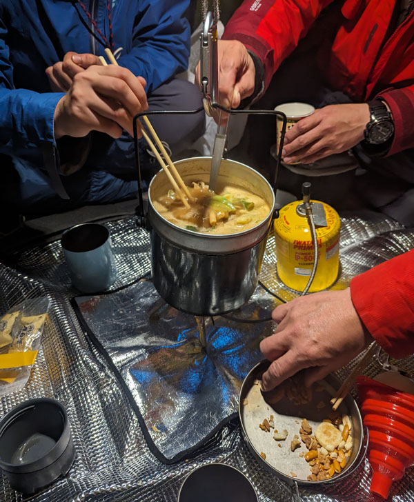 明日に備えて早めの就寝となったが、足先が寒いのと整地がうまくできておらずテント内が坂になって入口側に滑り落ちてしまうため、あまり眠れなかった。整地は非常に重要な事がわかった。翌日聞いたところ皆も寒さでなかなか寝付けなかったようだ。