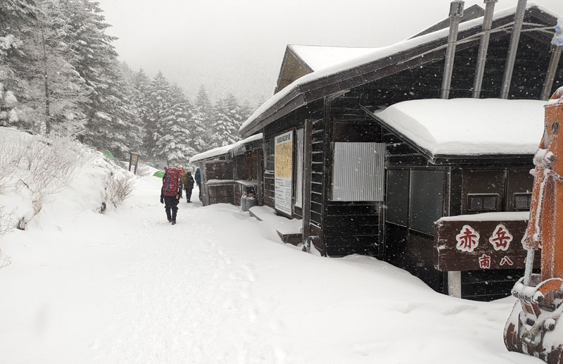 八ヶ岳山荘から赤岳鉱泉までは穏やかな斜度であるが冬装備がやはり重い。フライ・ポールを分担で持ってもらい、14時にキャンプ場に到着。