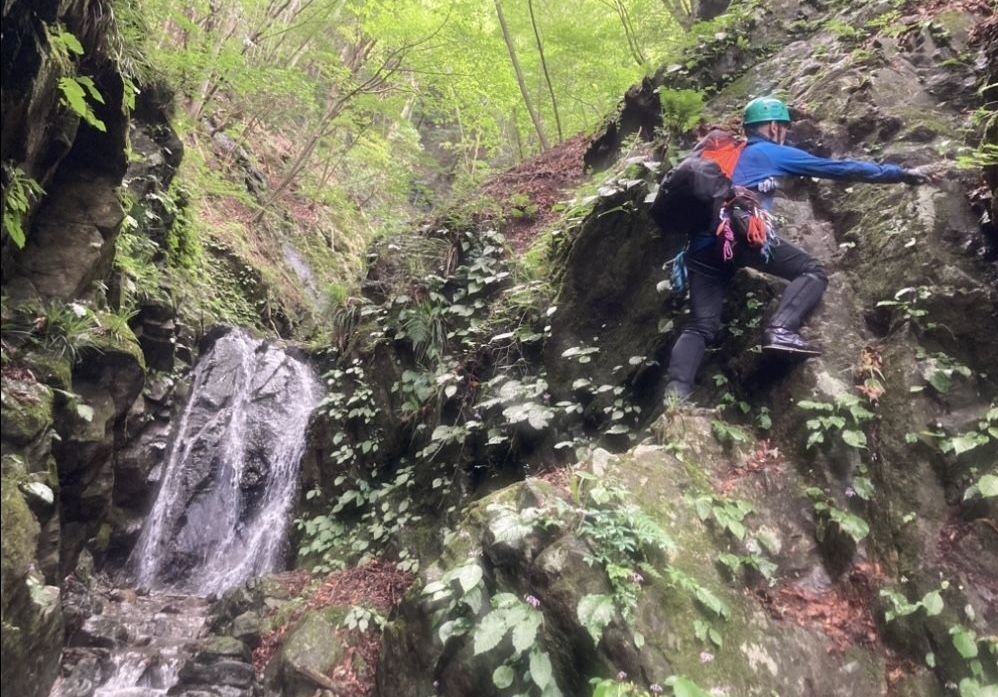小草平の最初の滝。去年は一発目ということもあり先輩にリードしてもらった(⇒ 2023/7/8 小草平ノ沢)。今年はどうしようか迷っていたら、金澤さんより「ロープを引いたら安心だよね(気持ちが引き締まるよね)。中間支点とれないけど」ということでリード。最後ヒヤッとしたけど、ちゃんと折り返して落ち口でビレイできた。ムンターも間違いなく。