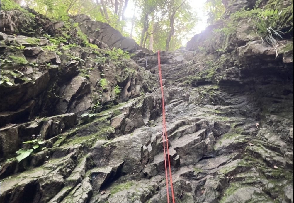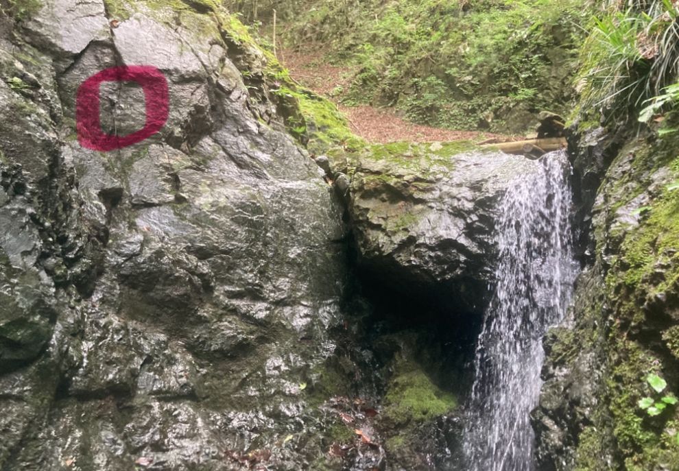 CS滝。去年は水流を避けて左側の脆い鋭角の岩の階段を登って、枯れた根っこが折れてヒヤリハットのビレイだった箇所。今年はよく見たら、残置ハーケンとお助けスリング(赤丸箇所)のところから右側、滝の落ち口に向かってしっかりとしたバンドがあることが判明。なぜ気づかなかったのだろう。左には高巻き用に、木の幹にスリングがたくさんぶら下がっている。そればかり見て上に行こうとしたのかなぁ。今年は落ち着いて観察し、その残置ハーケンに中間支点(60cm)をとって、無事に滝の落ち口へ。