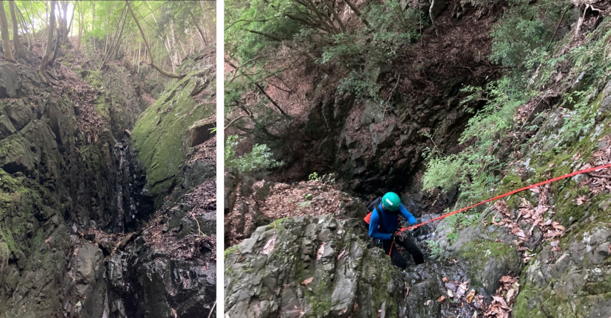 懸垂下降をしながら涸滝を観察。こんなところどうやって登るのか・・・ 薄暗くて手がかりも少なそうだ。