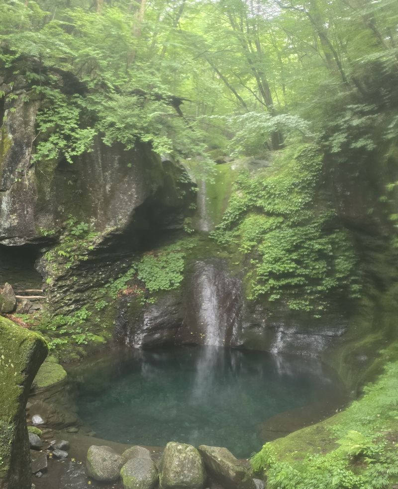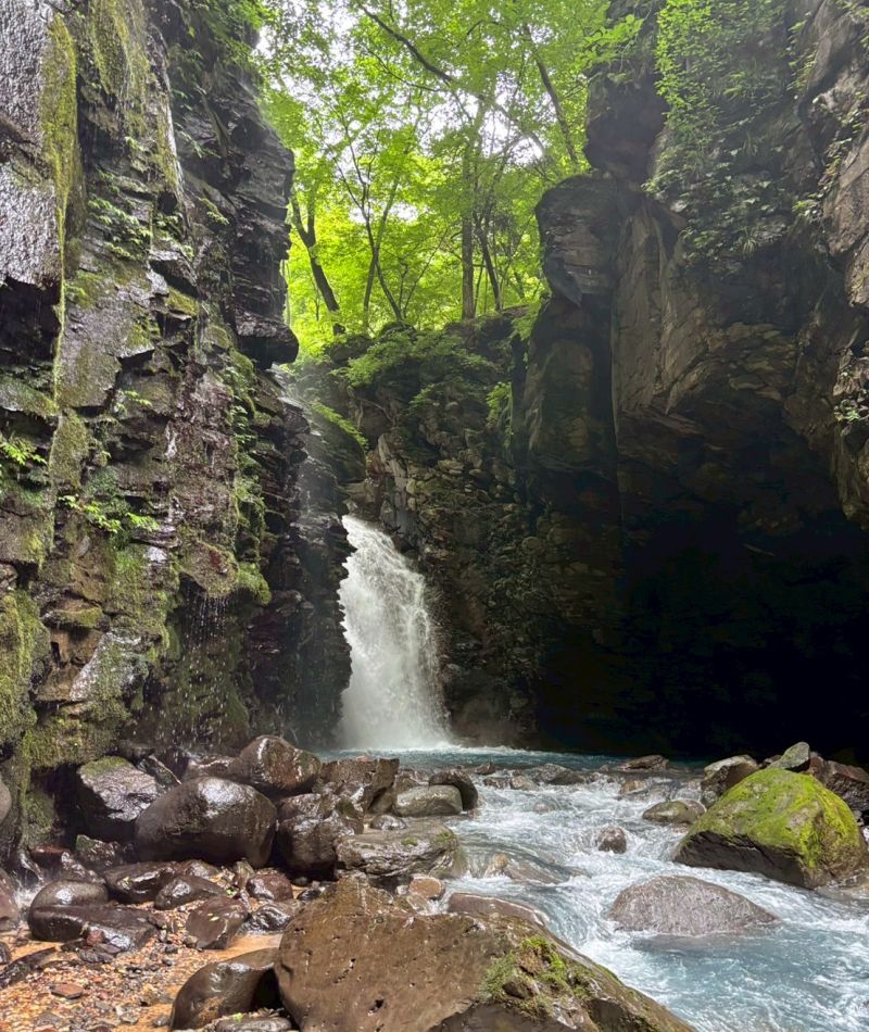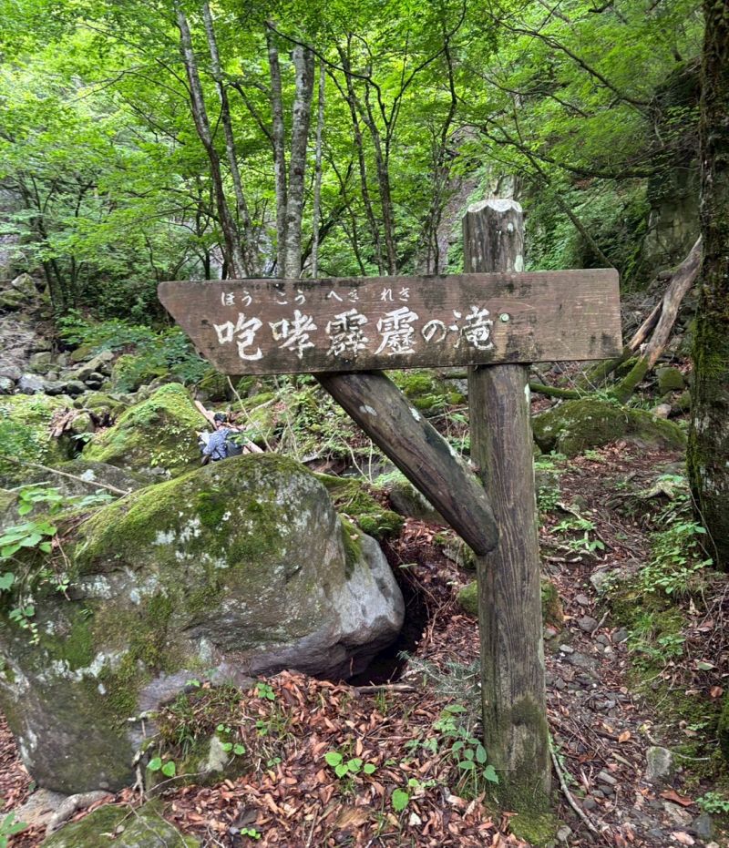石が大きく歩きずらい。ほとほと飽きてきたところにラストのおしらじの滝。前日が雨でないと流れていないため幻の滝と言われているらしい。木曜が大雨だったので期待していたが、残念ながら水は落ちていなかった。