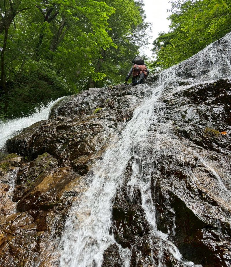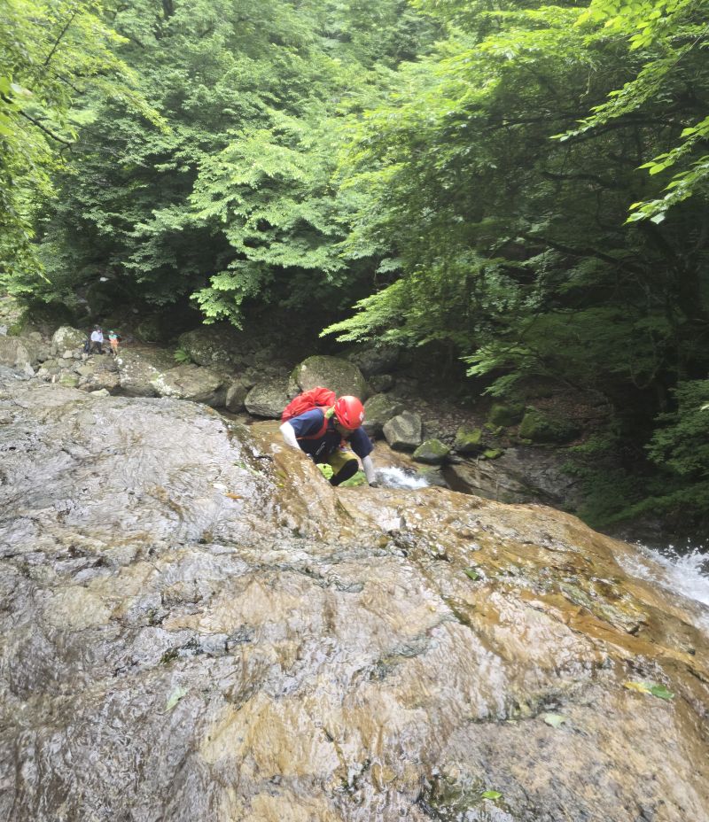スッカン沢に隣接する沢なのに不思議と水の色と岩が全然違う。こちらも水がとても綺麗。咆哮霹靂の滝は二つに別れた大きな滝だ。右側の滝を登る。
