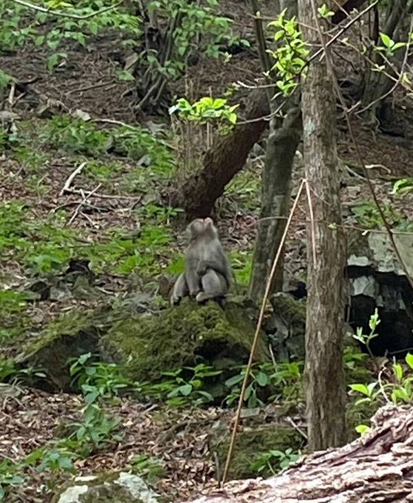 よく見るとあちらこちらにたくさんの猿。子猿もいる。 我々が進むと猿も進む。5m滝の上の子猿(写真の赤枠内)は我々を偵察に来たのか。