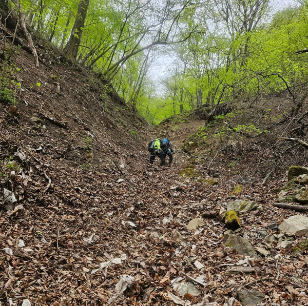 詰めは落ち葉でふかふかしており歩きにくかったが、スイスイ登る大野さんと平さん。