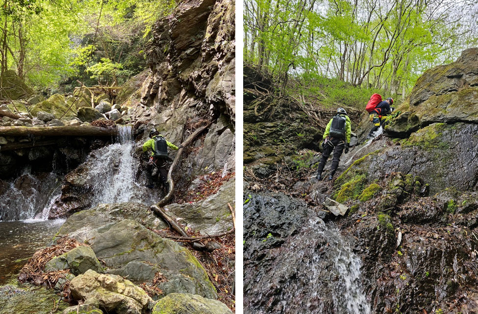 終了近くの滝がヌメって怖く、鹿内はお助け紐で登った。