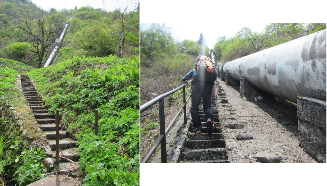ここから大明神山への尾根へは送水管脇を上がる。プレートによると有効落差221.20m、本管の鉄管延長434.117m。狭くて長い階段を上がると取水口(上流の沢からここまでパイプを敷設してある)から南へ向かう巡視路らしい道があるが、ほぼ水平に進むばかりで尾根に取り付く気配がない。取水口に戻って改めて周囲を探ると、空身で木登りのようによじ登った藪の中に赤テープがあった。この藪斜面を重いザックを担いで登るのは到底無理だ。赤テープや参考にした記録は雪が藪を隠した時のものなのだろう。大明神山は諦め、片貝山荘まで行って阿部木谷~毛勝谷経由で登頂できないか確認することとした。