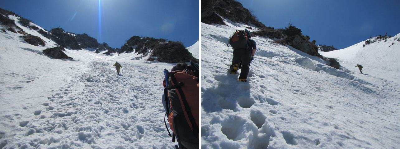 1234mを過ぎて大明神沢を分け、毛勝谷に入る。先行する単独行者や後ろに見えてきた数パーティは片貝山荘に泊まったのだろう。毛勝谷の出だしは幅も広く傾斜も緩やかだが、斜度が徐々に増していき、1550mを超えた地点でアイゼン装着。行く手の谷は再び狭まり、奥は右に曲がって見通せない。