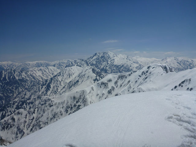 決めておいたリミット時刻も近いので、南峰は割愛して北峰との鞍部から下山することにする。雪はグサグサだが斜度以外に困難はなく、登りもやはりこちらがよかった。傾斜が緩み落石の心配もない場所まで・・・と足を出していたら、結局、1234mのすぐ上まで、標高差1100mを一息に下ることになった。