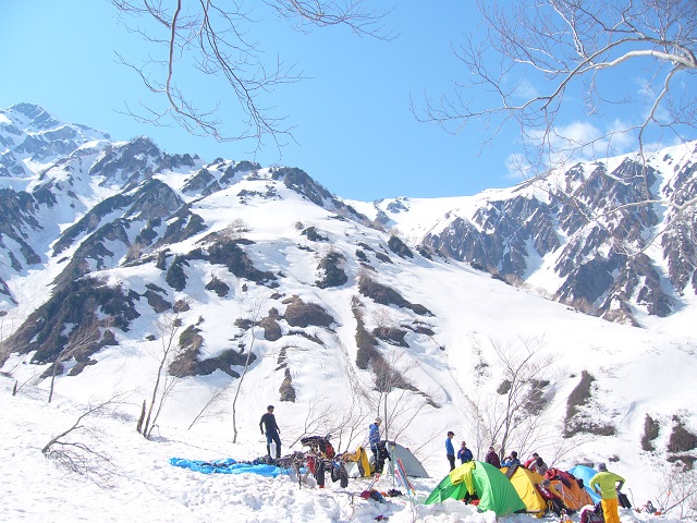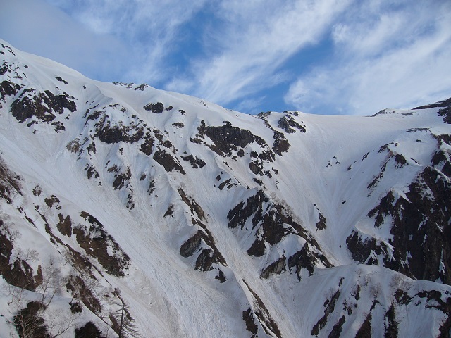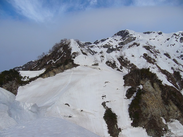 裏銀座から剱岳まで一望できます。 【経路と時間】 1日目 白馬駅(11:40)=駐車場(12:00)~白馬尻(14:30) 2日目 白馬尻(3:10)~白馬岳主稜~山頂(9:55/10:25)~白馬大雪渓~白馬尻(12:15/13:25)~駐車場(13:55) 【感想】 ■木村 白い峰々に囲まれた中、初めて白馬岳の山頂に立つことができて、とても感激しました。 時折、雪が少しシャーベット状になっていて踏み跡が崩れかけましたが、山頂付近が雲に覆われて日が翳ったおかげで、最後まで安定して登ることができました。 今回、ツインロープ30mを1本持参しましたが、トレースが無い時に登る場合は50m以上あったほうが良いかもしれません。ちなみに最後の雪壁にはバケツがいくつか掘ってありました。2~3ピッチで登るパーティーがいるのかもしれません。 最後に猿倉無料駐車場の情報をお伝えします。猿倉には2つ無料駐車場がありますが、私たちが到着した昼頃は猿倉荘直前の駐車場は数台の空き、その下側の駐車場は半分空いているくらいでした。早朝のほうが混んでいるかもしれません。注意事項として、猿倉荘前の駐車場は猿倉荘宿泊者専用です。 ■二見 幾つかのガイド本を見たりしてかなり不安を抱いていまいしたが、天候に恵まれしっかりしたトレースが味方して7時間足らずで山頂を極めることが出来ました。(リーダーが優れていた事はもちろんです。)岩場の地形図は拡大しても、沢の様に2万5千分の1ではルートを特定出来ません。稜線左右が切れ落ちていて最後は胃が痛くなりました。今年の積雪は多いかと思っていましたが6年前の杓子岳の時のような雪庇は発達していませんでした。湿雪でクラックが所々あり、踏み抜いた場所が空洞の所もありました。アイスバイル無しのピッケル1本で、片方の手は指を雪面に突っ込んで何とかなりました。太陽が照っていて紫外線が強く、帰って来てから顔が炎症を起こしています。山頂近くは曇っていて助かりました。風は一時、中程の稜線で吹かれましたが、後は快適でした。気温は3~12℃? 何度かアウターを脱いだり着たりしました。心肺能力の減衰(加齢?)登りはかなりのローペースで(リーダーはアドレナリン全開で食欲旺盛好調です。)追いついて来た長野出身30代?のソロ男性とほぼ同じペースで三角点近くに登頂しました。曇っていた天気も2932mの山頂では暫くすると雲が取れ絶景です。縦走中のパーティーもたくさんいます。疎い山座同定を教わり、満喫感を味わいながら白馬山荘に、雪が融けていてアイゼンがちびります。白馬岳頂上宿舎(閉まってます)~大雪渓。雪崩の心配がありましたが午前中で安定していると判断して下降開始。広ちゃんは尻セード具で先行(数名が同じようにどんどん進んで行く)、次回は買ってこようと思った。周囲デブリがありましたが雪質は硬くはなかった。「あずさ」が間に合いそうなので急いでテントを片付けて帰路に就きました。稜線ビバークも覚悟していたのですが、予想を超える行程に幸福感いっぱい、山行は辞められません。