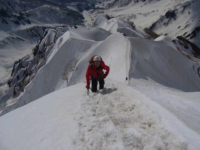 急登の連続で汗をかきます。山頂までトレースがあり、最初から最後までロープを使わずに進みます。