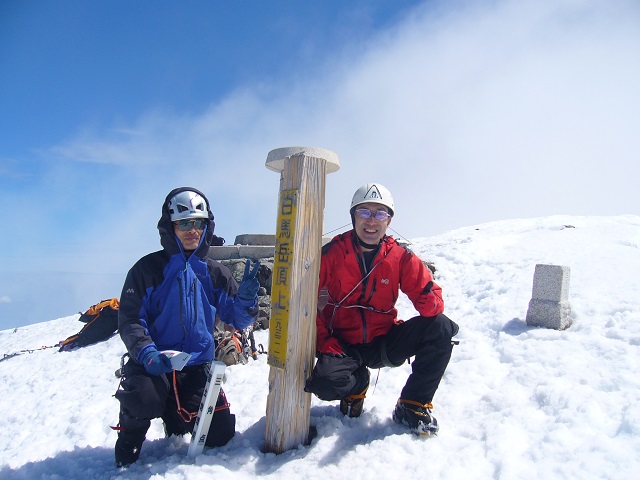 山頂に到着すると間もなく雲が離れていきます。青空の下で記念撮影です。
