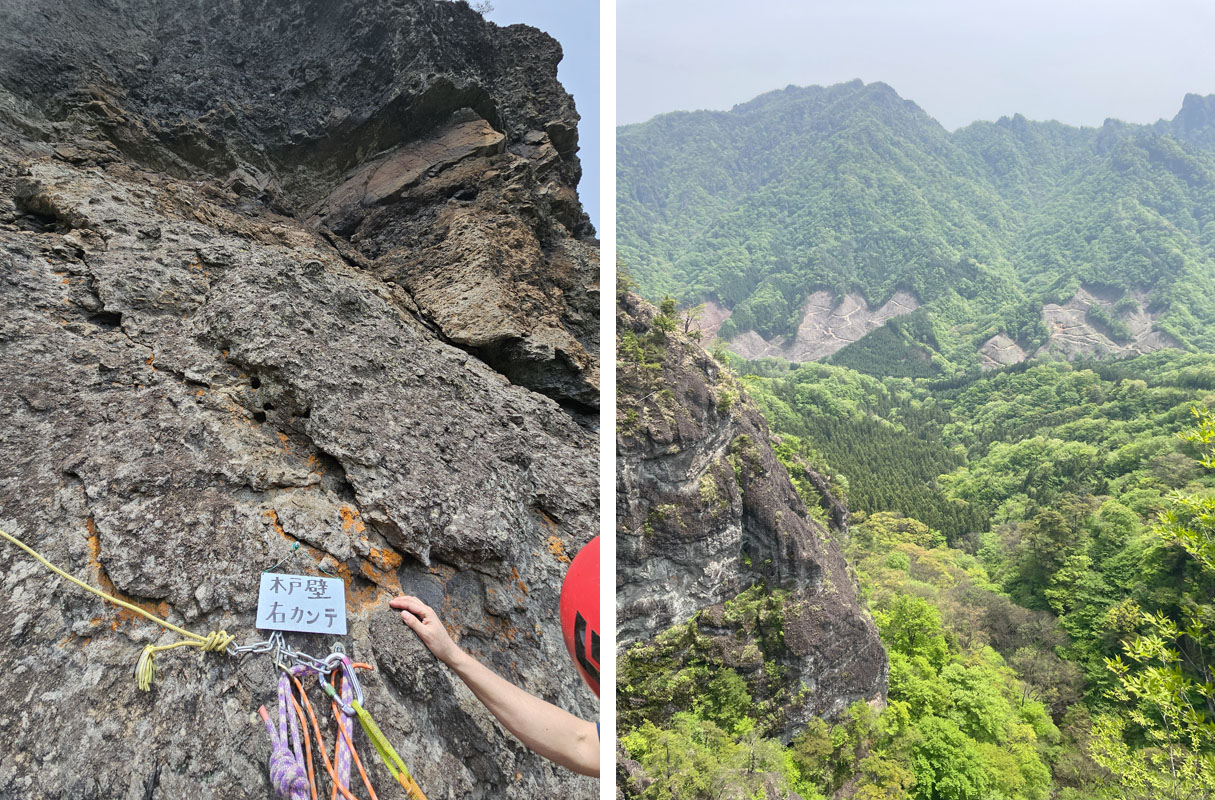木戸壁でマルチピッチクライミングを行った。初心者にビッタリの易しいグレード、核心は下り(岩がロープに引っかかる)と噂のゲレンデだ。裏妙義の国民宿舎跡から、途中ヒルを発見してもういるのか・・・とガッカリしながら40分ほど歩いて取付きへ。