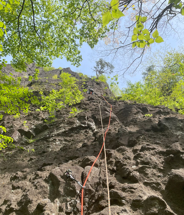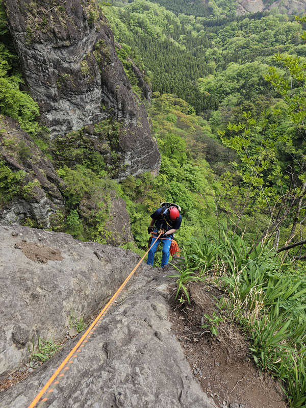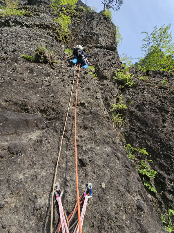 下りてもボルトが見当たらず間違いとわかったが、登り返しが面倒なので一旦降りてしまった。そこから登り返しを試みるも登れる岩ではなく、両サイドに下げていたロープが落ちて下の薮に引っかかってしまったので、回収のためさらに下へ。