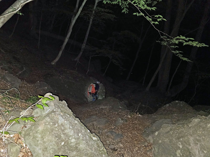 これが正解だった。緩い坂道と思ったそこは、崖で薮岩だったのだ。ロープを1m残すのみのギリギリで着地。今度こそあきらかに下に着いた感覚がする。左を見ると道が続いていて、すぐに取付きに。どうにかこうにか戻れて安堵した。ここで20時。降り始めからなんと7時間半が経過していた。
