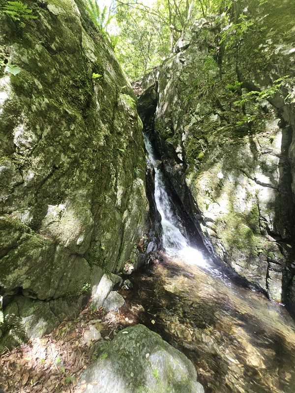 前回は講師にロープを出してもらって登った滝である。今回も1箇所くらいはロープを使ってみようと準備し八重樫が登り始めるが・・・ぬめる! 冷たい! 氷水! 手がかじかむ! ということであっさり断念し、巻くことにする。結果的にリベンジ軍刀利沢は巻き巻きの沢登りとなった。