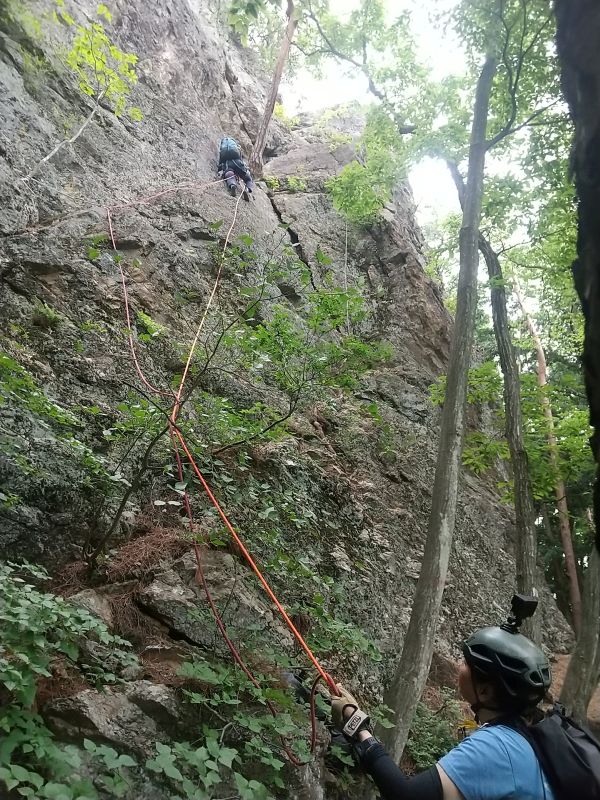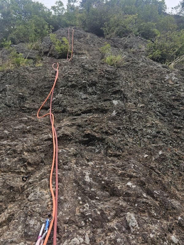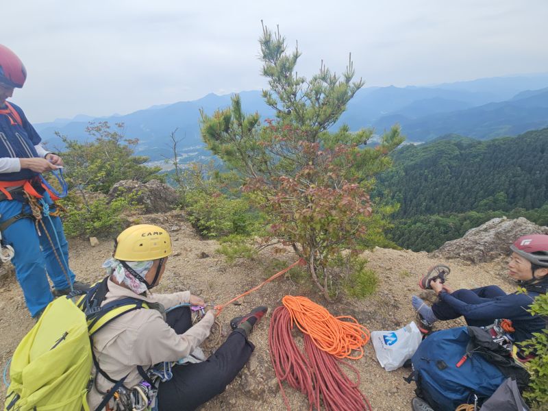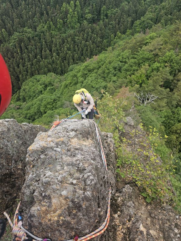 みんカラにはフィックスが2本との記載があったが1本しか見当たらず。立木も小さく数がないので、ややランナウト。40mほどロープを繰り出した。