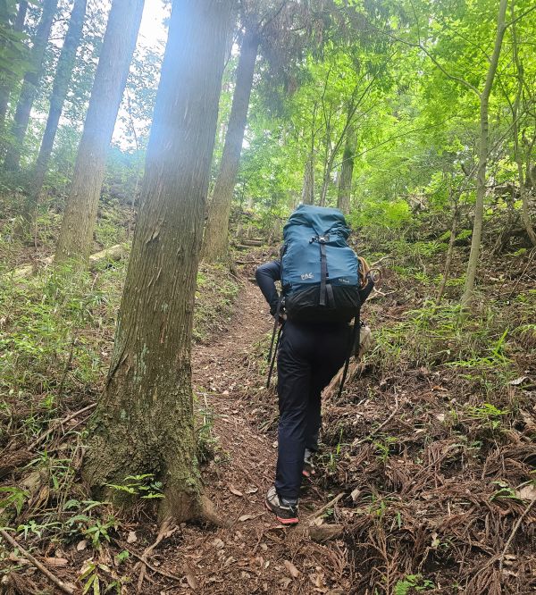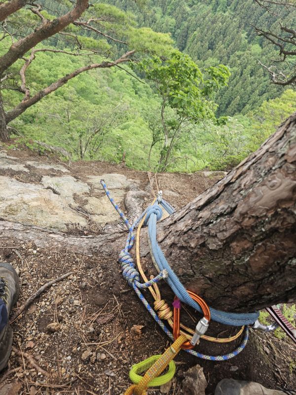 その下の立木に懸垂支点があったのでロープ1本で降りたが、長さが足りず途中の木でピッチを切る。流れ止めで末端を結んだ部分まで降りたので本当にギリギリのところ。こういう事があるから絶対に末端を結ぶのを忘れてはいけないと再認識した。すぐ下に登山道が見える。50mを繋ぎ合わせていればそのまま行けた距離であった。