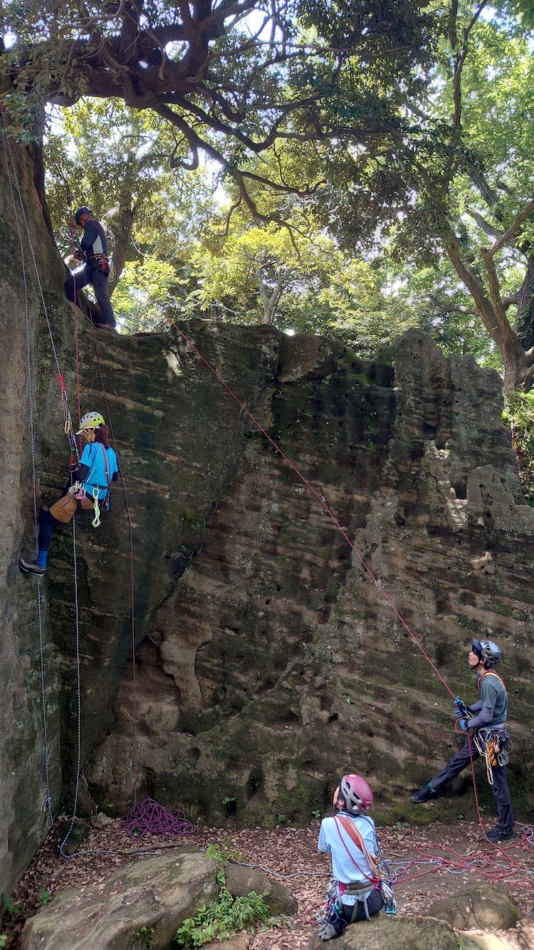 練習として、<セカンドのビレイ→(a)ビレイデバイスからムンターへの切り替え→(b)ムンターでのロワーダウン→(c)1/3システムでの引き上げ>の3ステップをつなげた。
