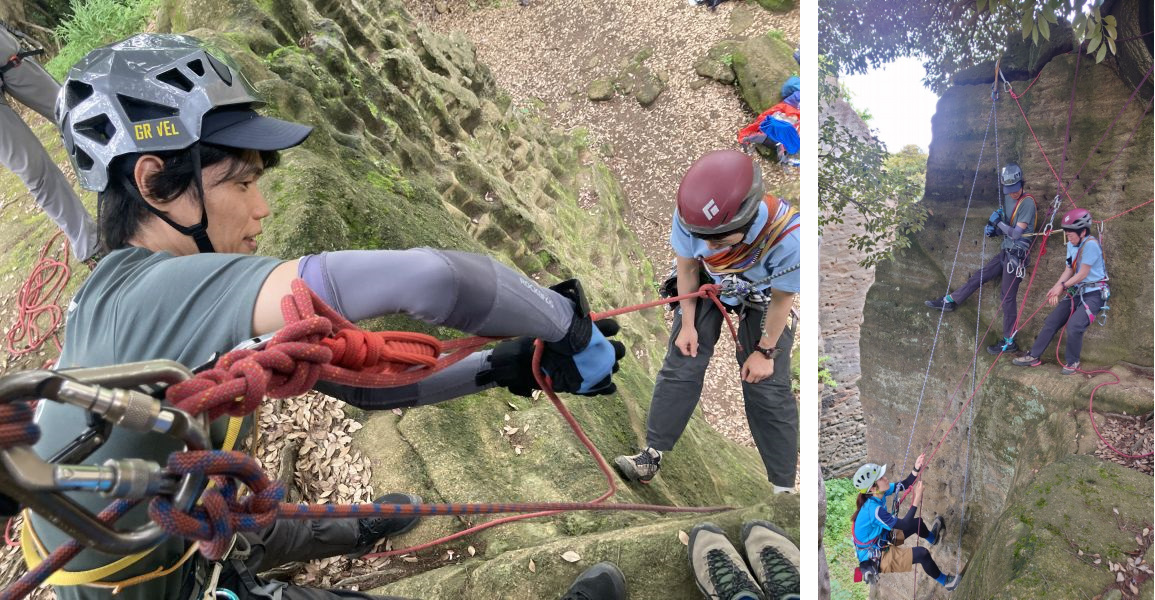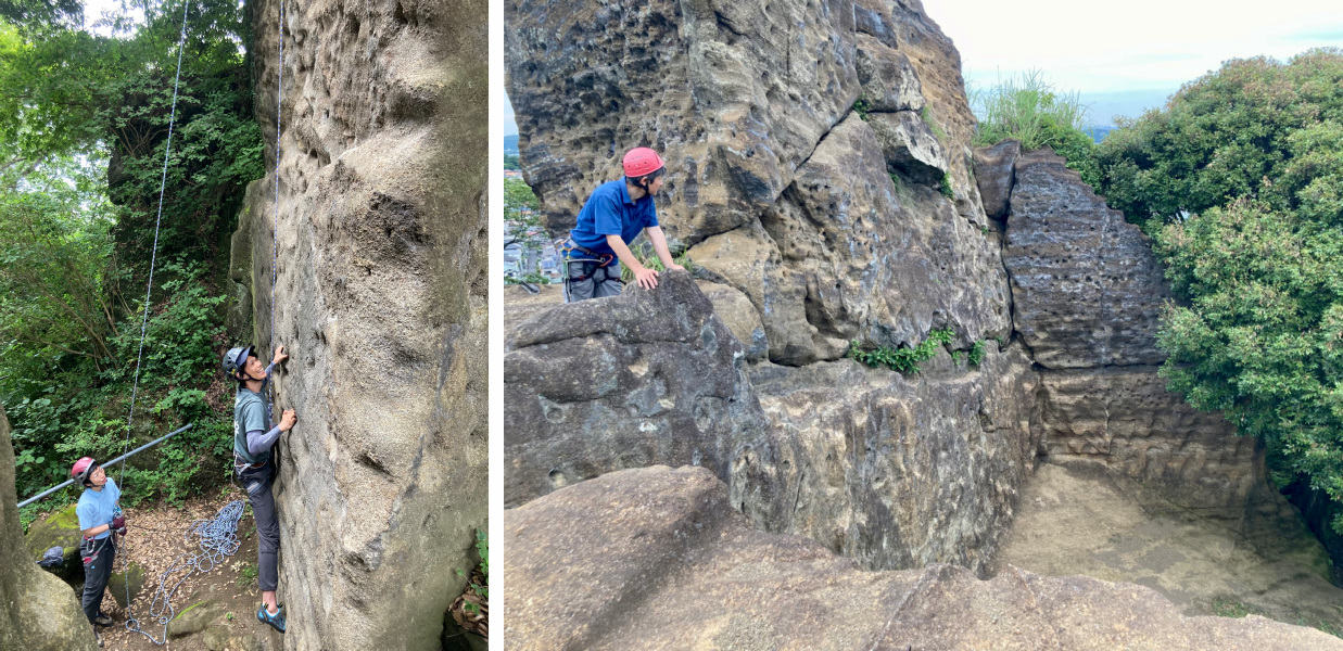 最後に、コの字裏トラバース側(下の写真・左)にトップロープを張ったり(窪みが手前に傾斜していて全然手がかからない!ゲキムズ)、コの字トラバース(同・右)を見学したりした。練習したい内容に応じて、様々な活用ができそうだ。