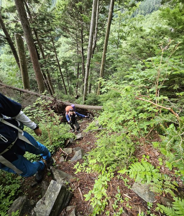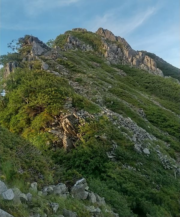 ピークに向かって直登すればよい。一部3級程度の岩登りがある。