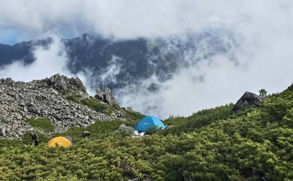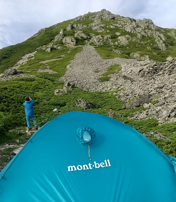 4人用テント3張り分のスペースがあった。雨は上がったが風が強く、今日は予定通りここでテント泊する。数時間後に2人パーティが到着しテントを設営した。