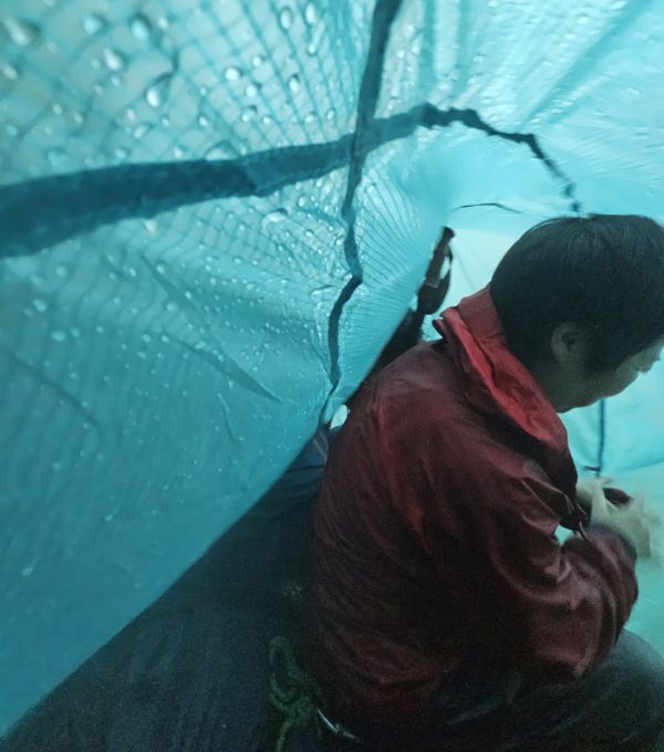 9時ころ、2100m付近でテントのレインフライを4人で被りストックを立てて雨宿りした。雨に濡れて寒くなってきた体にレインフライの中は暖かく、力が戻ってきた。