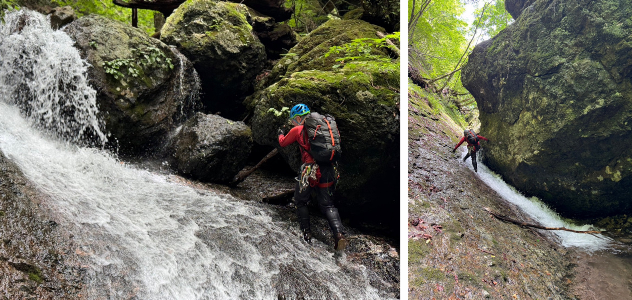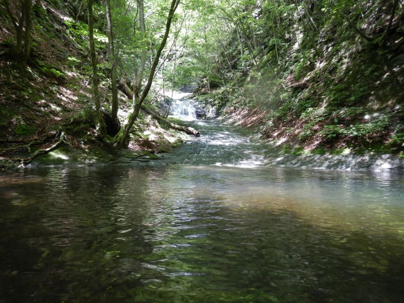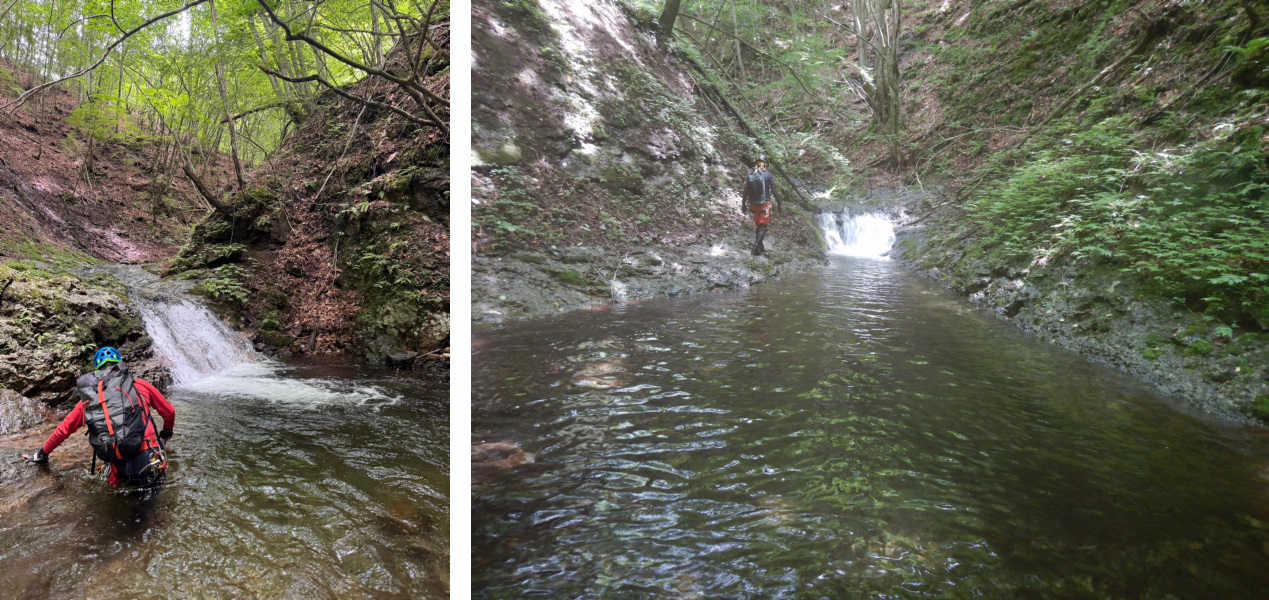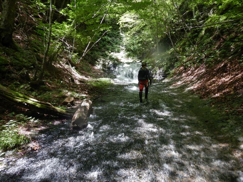 ナメは終始続き、想定以上に長い。時折深い釜やトロも現れる。梅雨は明けて下界は猛暑であるが水は冷たい。