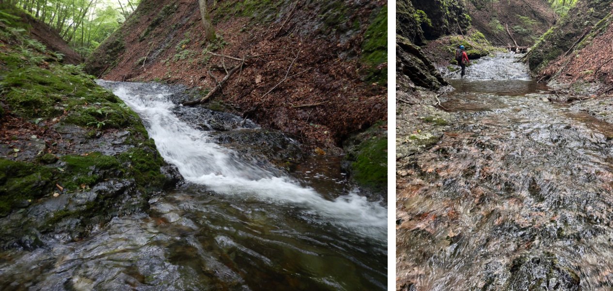 1170m付近で再度深い釜とナメ滝(下の写真右は滝の上部から)。