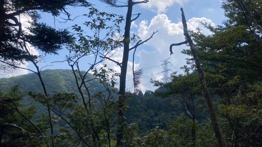 序盤、960mの屈曲点までは急登で汗が噴き出る。その後方向を変え1044ピーク以降は緩やかで、風も出てくる。少し涼しくなってきた。意外と細尾根で気を使う。途中左手に少しだけ展望が望め、送電線が見える。後ほど横切る予定のものだ。