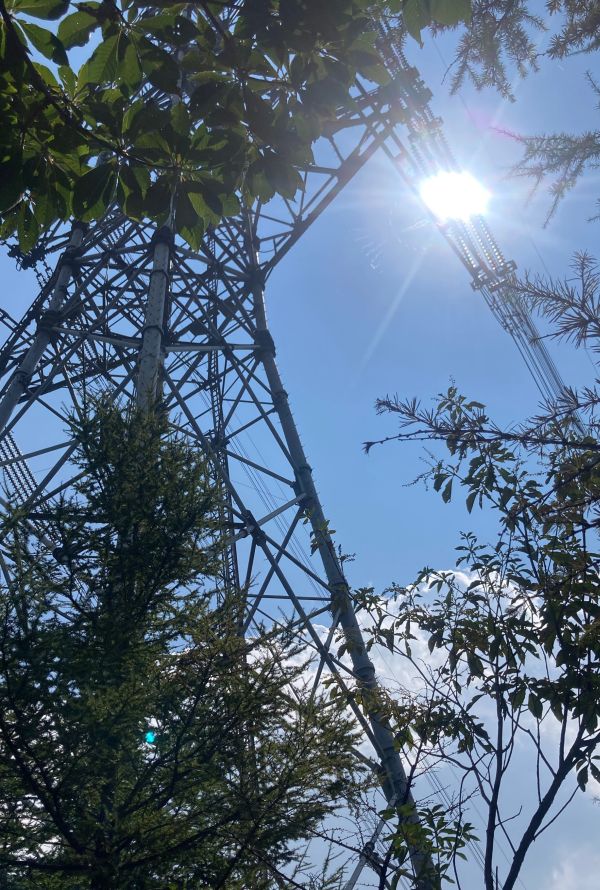 1290mからは東に進行。ランドマークとして、最初のコルで送電線が横切る。少し屈曲しているし尾根を乗り越すので、そこに鉄塔があることは地形図からも読み取れ、現物を確認できた。