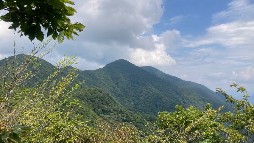 一部箇所では展望がよく、米沢山(よげさわやま、1357m)、お坊山、そして下山に使う尾根を見通すことができた。けっこうな距離感があり、歩き通せるかしらとちょっとだけ心配になる。