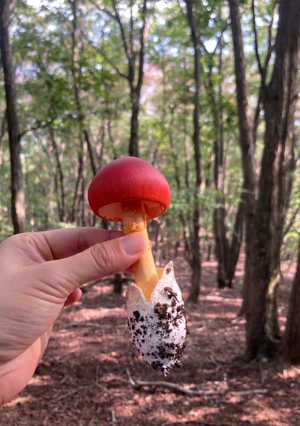 お坊山以降、後半は完全に踏み跡がない。時折鹿の気配(足跡、糞)を感じながら進む。タマゴダケも発見。