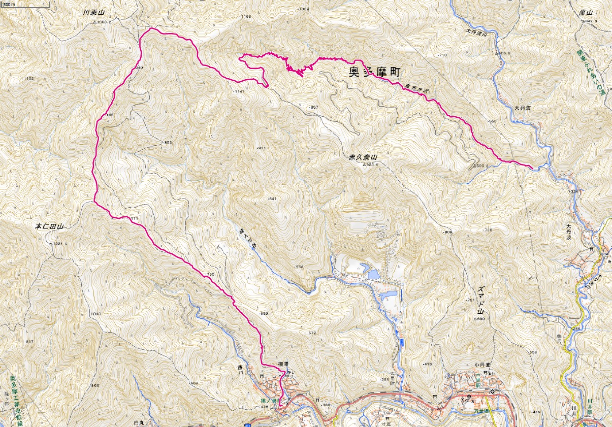 川井駅8:50~上日向バス停9:40~真名井北稜登山口9:50~林道真名井線終点15:30~舟井戸16:45~大ダワ17:30~瘤高山18:00~大根ノ山ノ神19:00~鳩ノ巣駅19:30