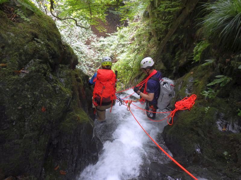 滝を登り、引上げ支点を構築するために立木を探したが、適当なものが見当たらない。そこで、滝の落ち口から少し離れた大きめの岩に240cmスリングを巻き付けて支点とし、滝の上部でメインロープを利用してインライン・フィギュア・エイト・ノットを作りカラビナを掛け、ムンターヒッチにて引き上げを行った。