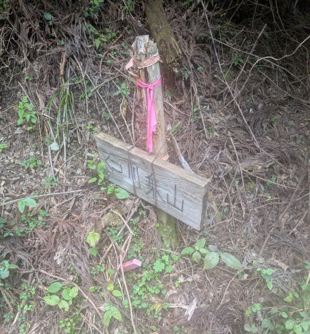 遡行終了地点の左側にピンクテープを確認し、そこから杉の植林地帯を登って林道の終点地点を目指した。ここでは秋永さんが地図と標高を確認しながらルートファインディングをし、ドンピシャで目的地に到達した。