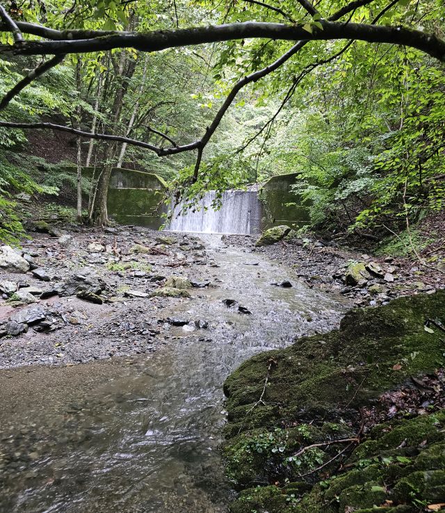 コンクリートの堰堤が見える。20℃の気温のためひんやりと寒い。ウェットスーツを着てきて正解。