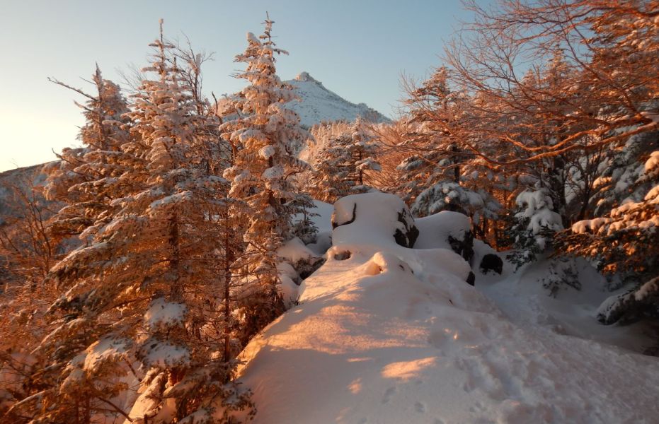 翌日は遅めの起床。テントを撤収し中山峠側から天狗岳を目指す。峠を過ぎたあたりで朝日に照らされた針葉樹林が美しい。