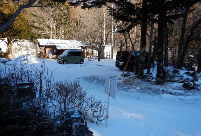 今年は雪が多く、稲子湯までの道路も雪で覆われていた。遅めの9時過ぎに到着したが稲子湯駐車場は意外にガラガラだった。
