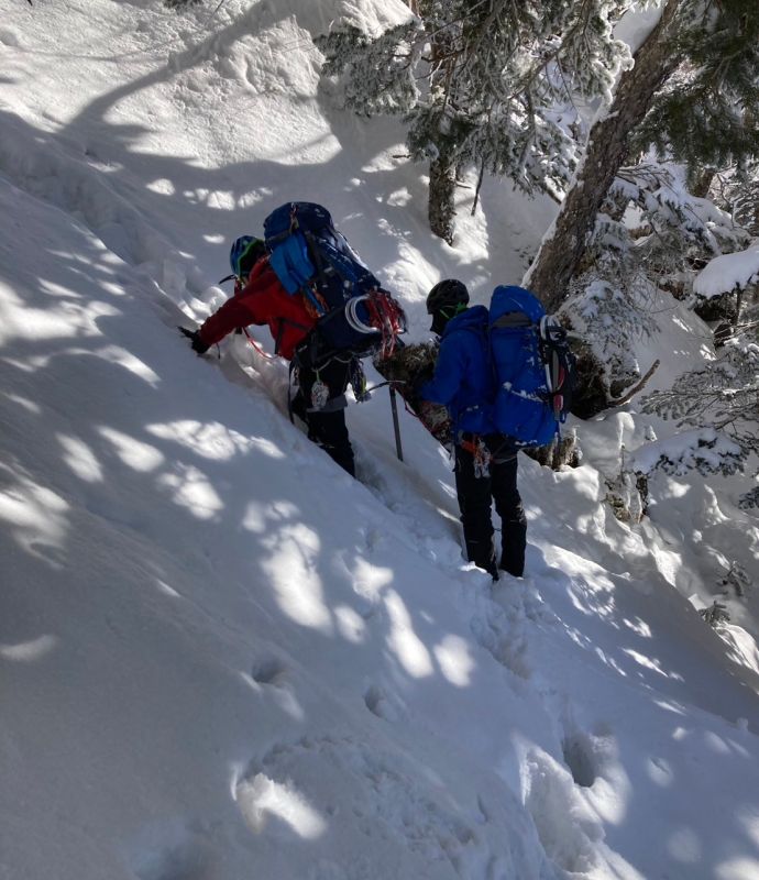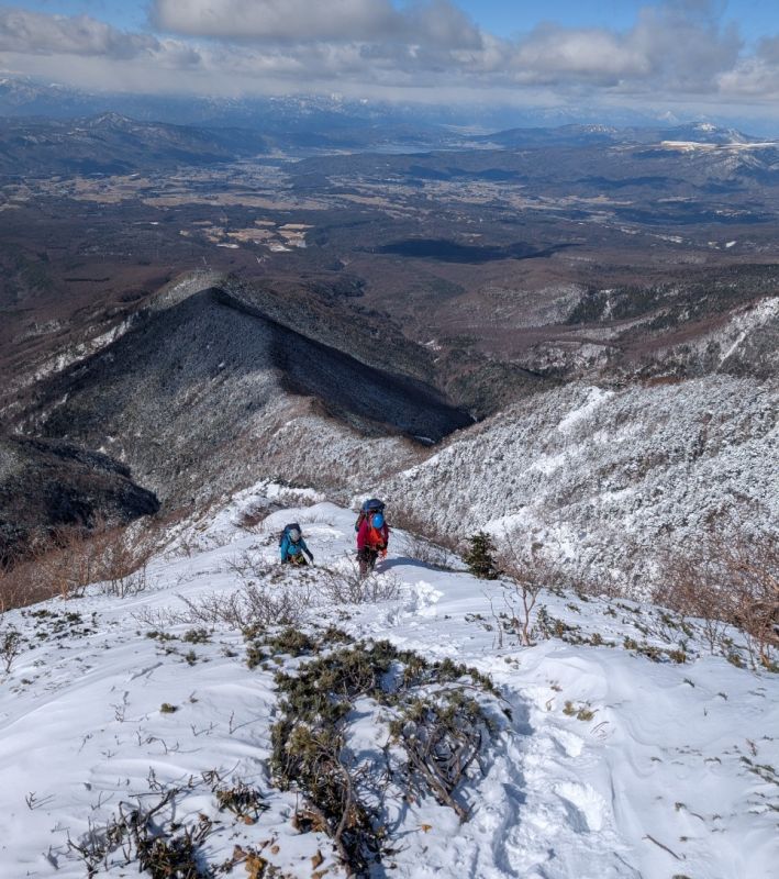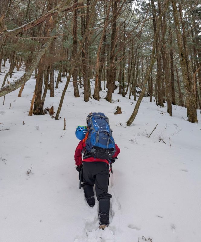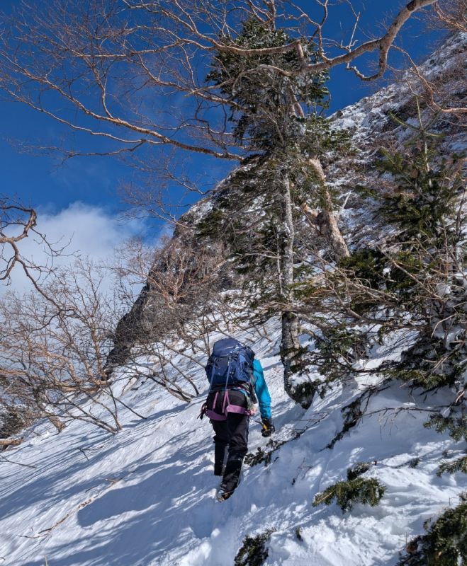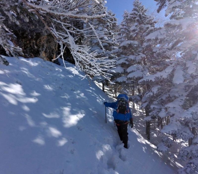 第一岩峰のトラバース中に日帰りパーティーに抜かれる。踏み固めを期待したが装備重量に差があり意味なし。