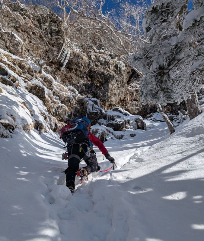 先行のトレースに従った結果、ルンゼはルートを外してしまったようで、ルンゼより奥の壁を登った。難しかったのでロープを出した。