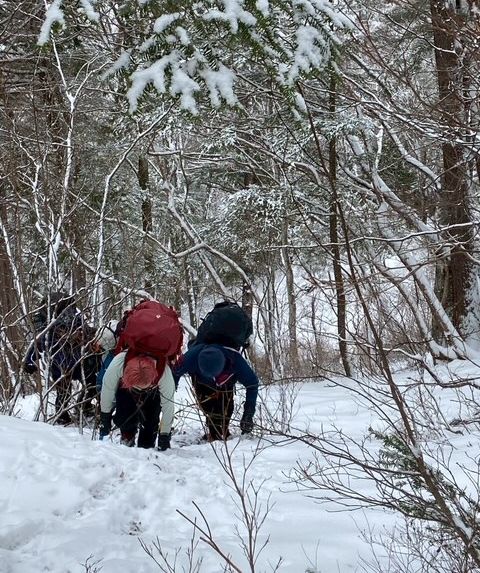 途中で風が強いからと引き返してきたパーティに会う。さらに進む。雪が降ってくる。また引き返してきたパーティと会う。山頂まで行けるのか不安がよぎるが、まだ進む。