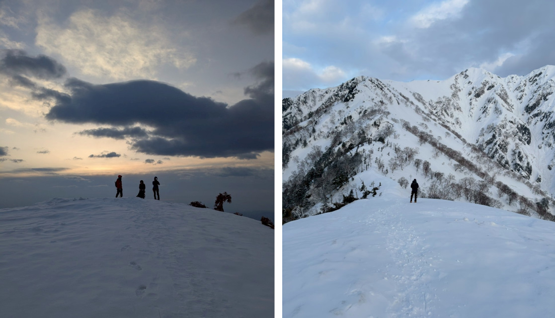 時折薄日も射す中、粛々と高度を稼ぐ。最初のピークで夜明け。景色に見惚れて小休止、写真撮影など。
