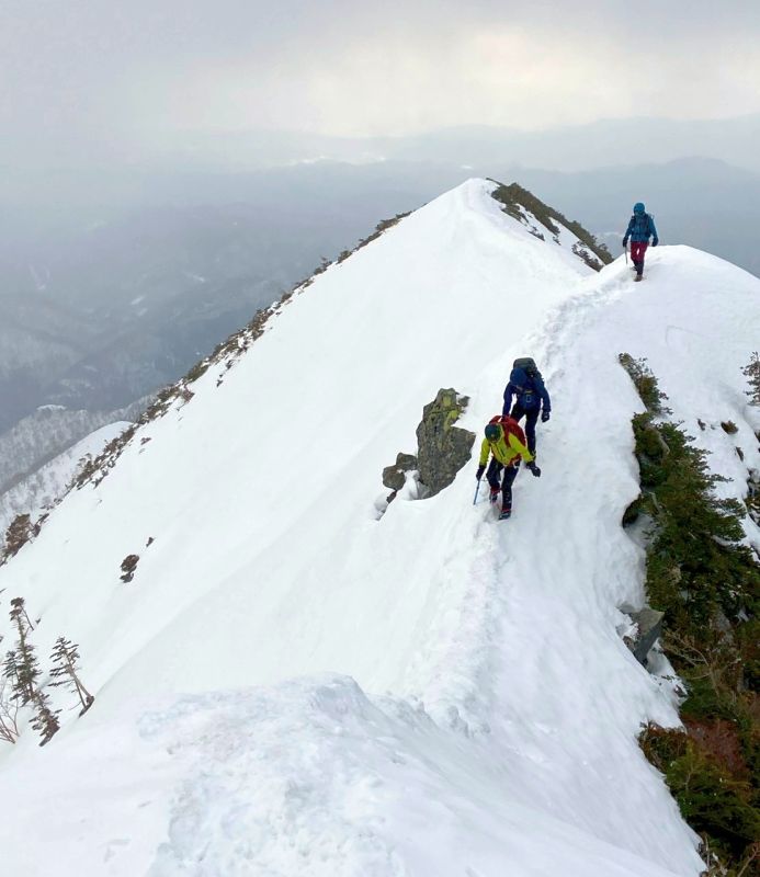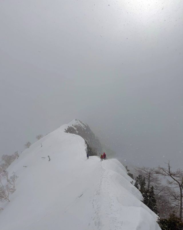 徐々に風が強くなってきて、雪の粒が顔に痛い。先行者が見えると、その先がナイフリッジ。トレースはしっかりあるので、慎重に歩けば問題はない。