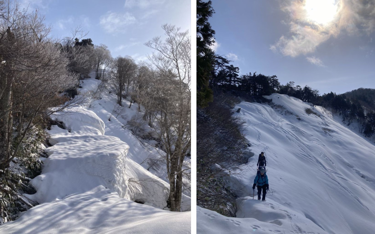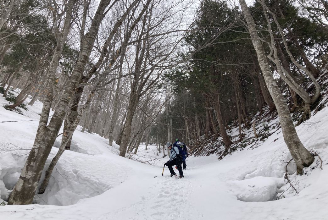 主に積雪期に登るルートということであり、他の時期であれば藪漕ぎをしなければならないところ。今回は藪に悩まされることもなく楽しく歩くことができた。なお、雪の状態によってアイゼンの効きが違うこともあり、歩行中は常に意識してフラットフッティングを心掛ける必要があることを痛感した。