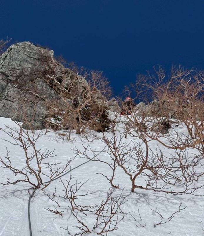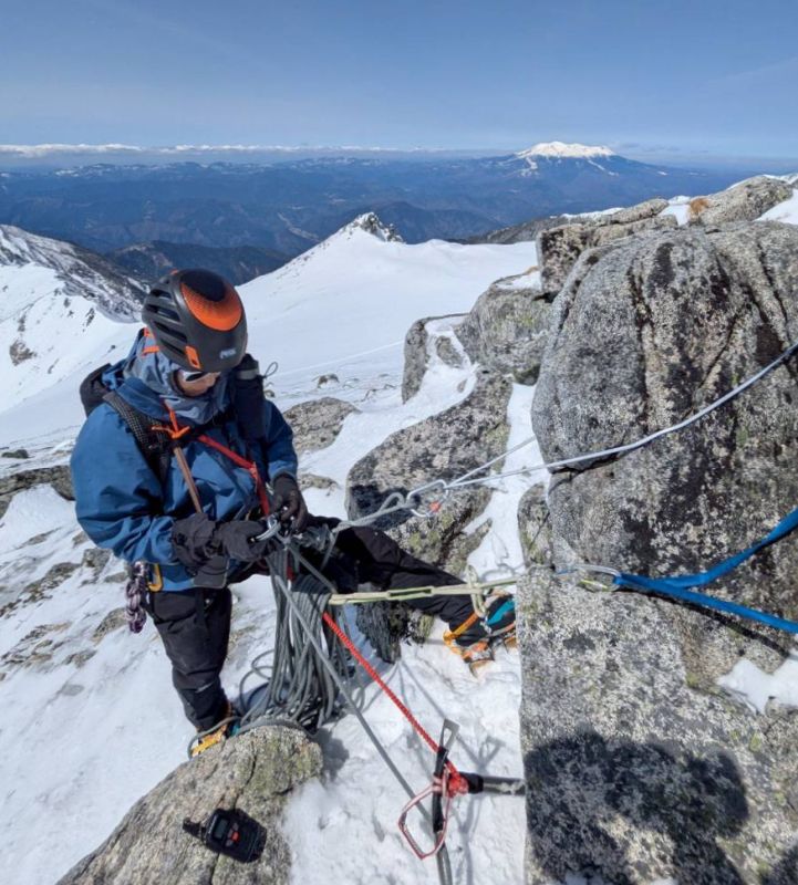 岩というより雪の急登と木登り。駿谷・大野ペアはさくっと登ったようだが、私は取らなくてもいい中間支点を取ってしまい、かなり時間がかかった。