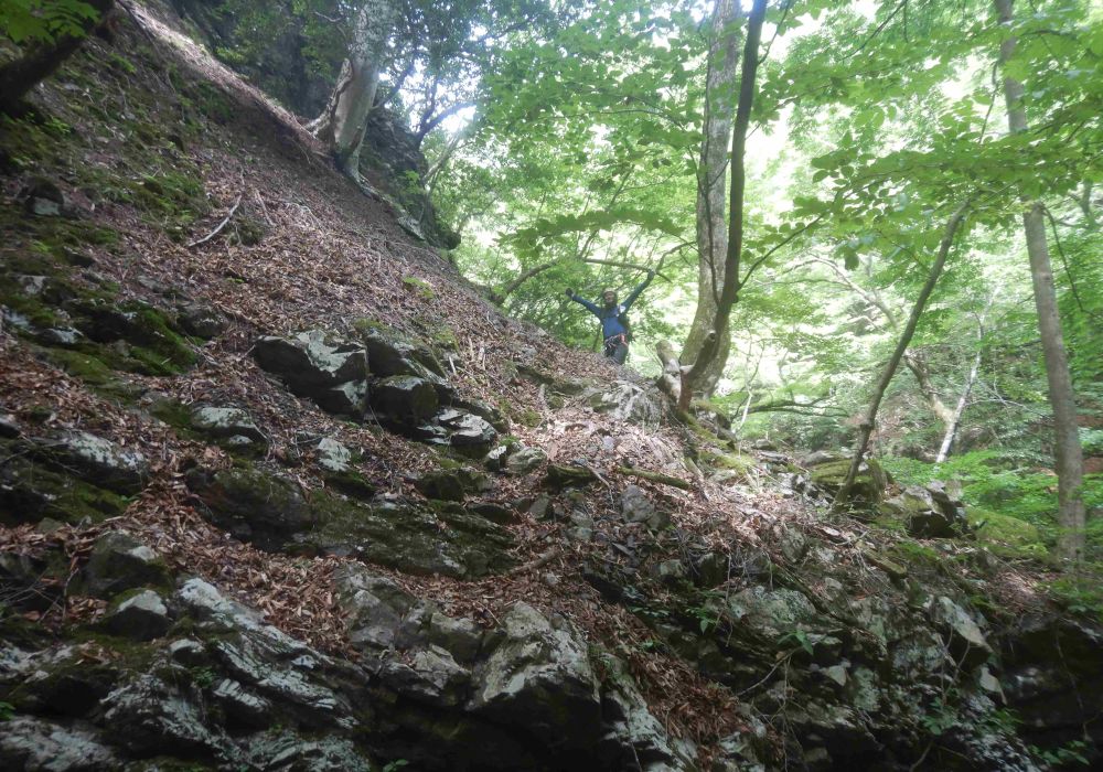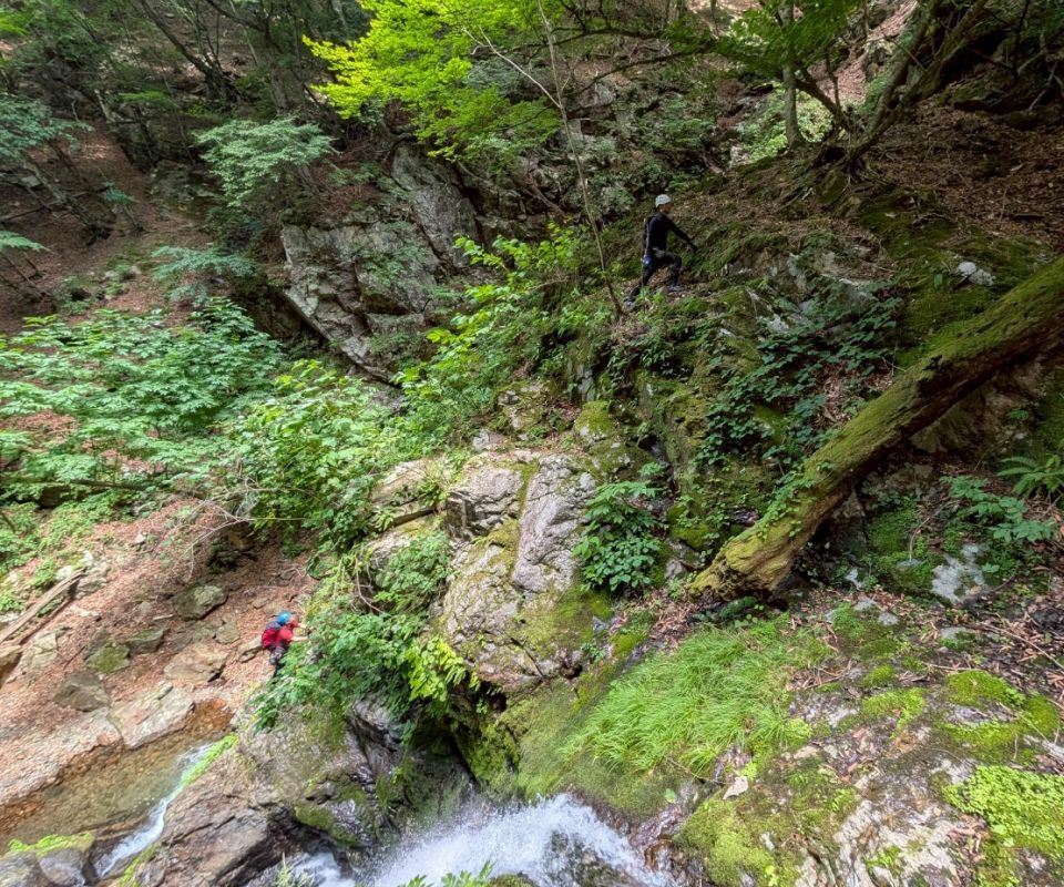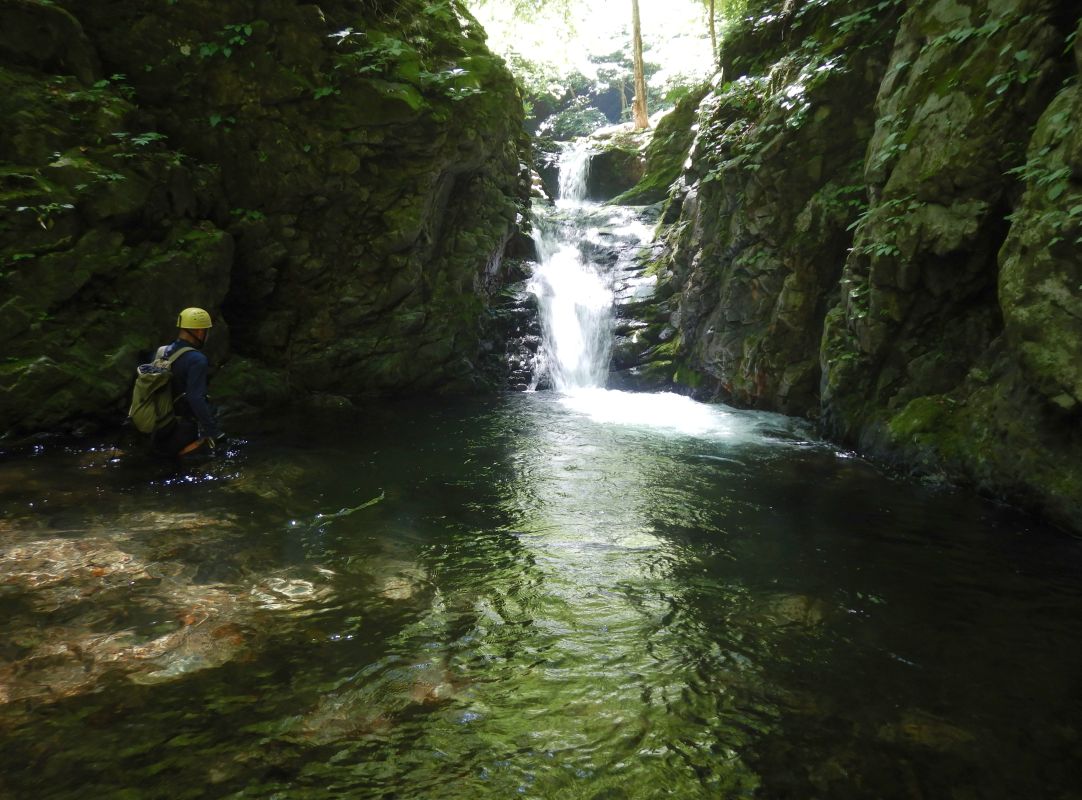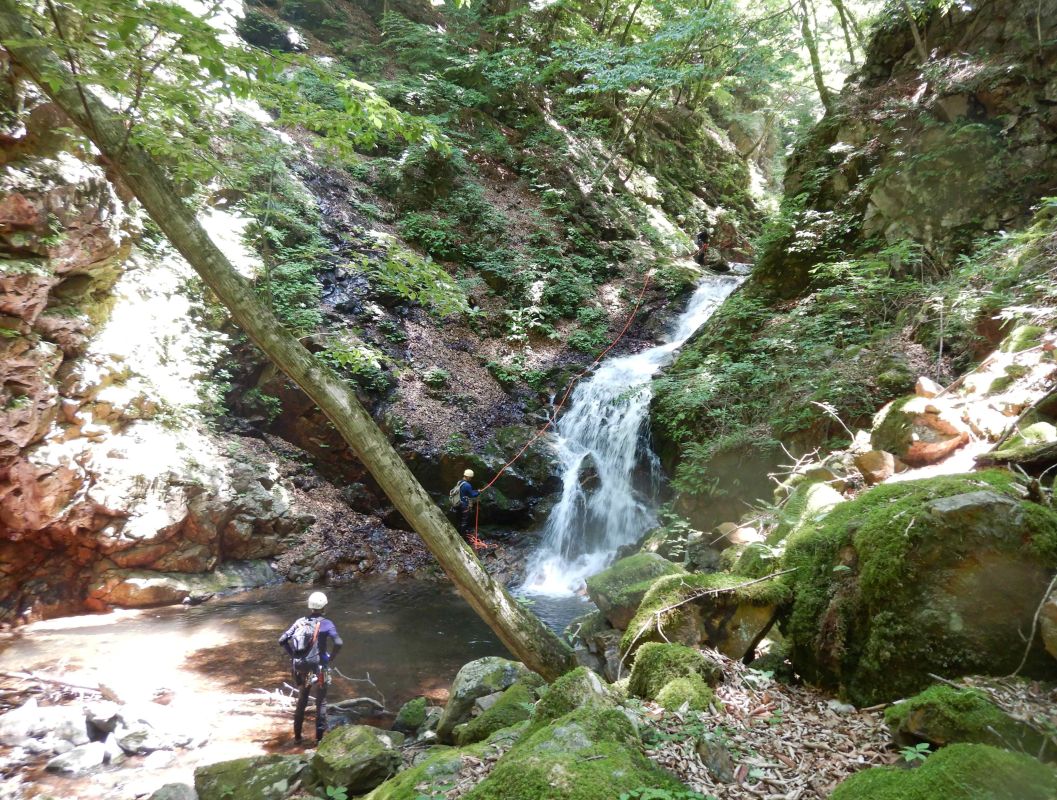 ヌメリがひどく滝の登攀は難しいという主旨のヤマレコが多いが、フエルト靴のフリクションがよく効いて問題なかった。タワシも使用せず。猛暑だというのに水はとても冷たく、盛夏の遡行がおススメ。